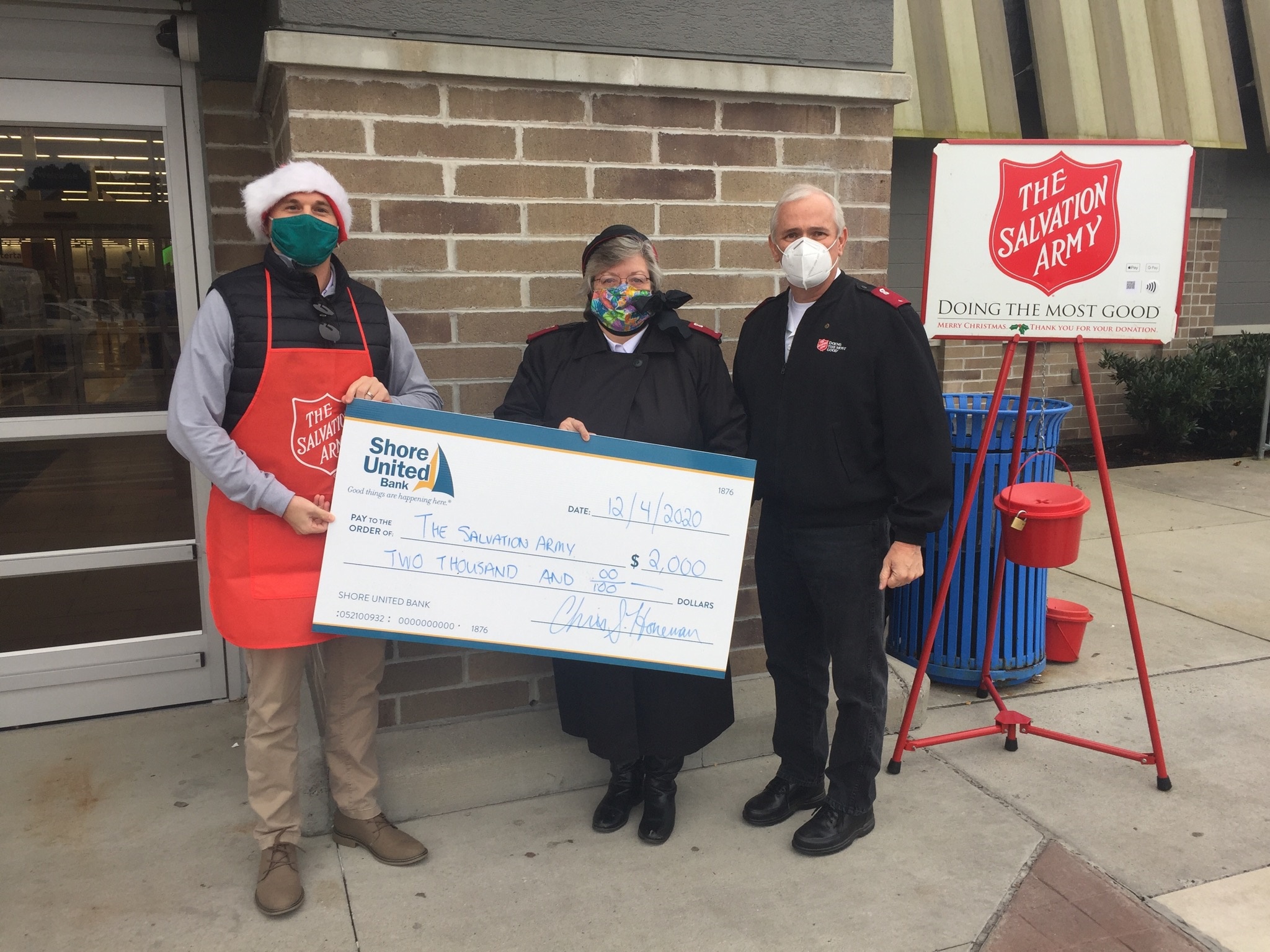 Shore United is honored to help kick off the Salvation Army’s Red Kettle Campaign to the Eastern Shore. According to Lt. Wendy Parsons of the Cambridge branch, the call for help has tripled this year. With fewer kettles out in front of stores due to the pandemic, the Salvation Army is hoping for corporate donations like the one from Shore United. “During this season of joy, we understand the increased demands with more people who become unemployed and have limited resources, the demand for food assistance will reach critical levels. As a local community bank, we understand the importance of responding to the needs of our community during this difficult time,” says Chris Honeman, Relationship Manager at Shore United Bank. “Helping the people in the communities we serve is our highest priority.” To assist with the food supplies to local communities, Shore United Bank has generously donated $2,000 to help purchase and distribute food to those in need.