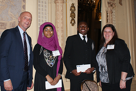 Jeffrey W. Bullock, Delaware Secretary of State, and incoming DBA Chair Cynthia D.M. Brown, President, Commonwealth Trust Company, present the 2018 Keys to Financial Success Scholarship to Maryam Woods and Justin Morgan.